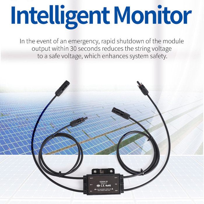 Το μοντέλο GD004-20/30 έχει σχεδιαστεί για διακοπή έκτακτης ανάγκης ηλιακών μετατροπέων σε οικιακά, εμπορικά και μεγάλης κλίμακας συστήματα ηλιακής ενέργειας. Ο συμπαγής σχεδιασμός του (120×77×17mm) και η προστασία IP68 το καθιστούν κατάλληλο για διάφορα περιβάλλοντα εγκατάστασης.
